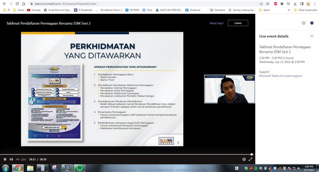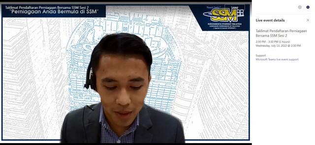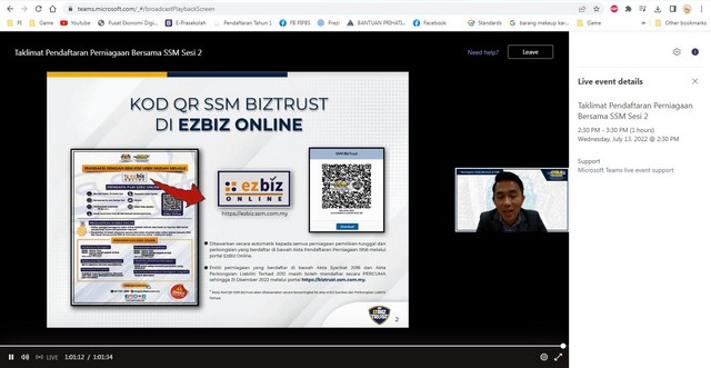 14 Julai 2022 | Aktiviti Terkini13 Julai 2022, Rabu – Pusat Ekonomi Digital (PEDi) negeri Perlis telah dijemput untuk menghadiri satu sesi taklimat kesedaran yang dianjurkan oleh Suruhanjaya Syarikat Malaysia. Taklimat tersebut telah diadakan secara maya menerusi platform Microsoft Teams (Ms Teams) dan dikendalikan oleh Eksekutif dari Seksyen Operasi,SSM. Objektif taklimat tersebut adalah untuk berkongsi maklumat berkaitan Pendaftaran Perniagaan. Antara topik yang dikongsikan adalah berkaitan pengenalan dan fungsi SSM, jenis-jenis entiti perniagaan, SSM BizTrust, produk SSM, tutorial pendaftaran serta pengaktifan ID pengguna di EzBiz Online.