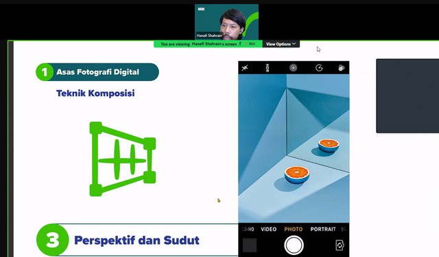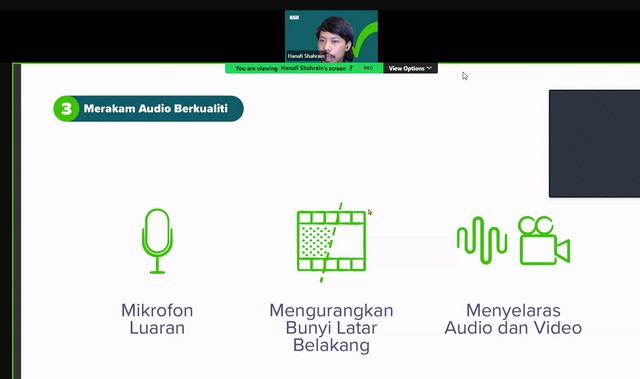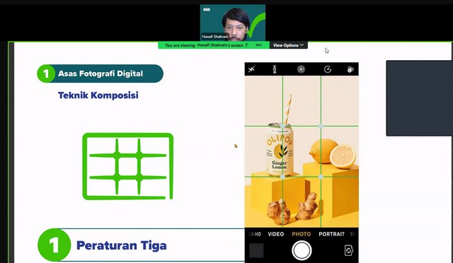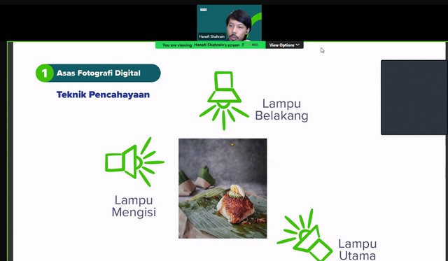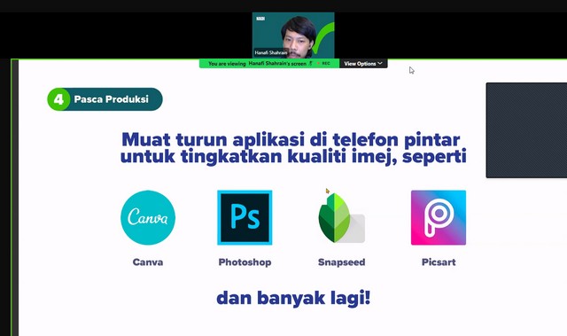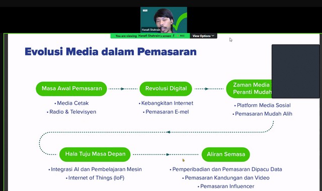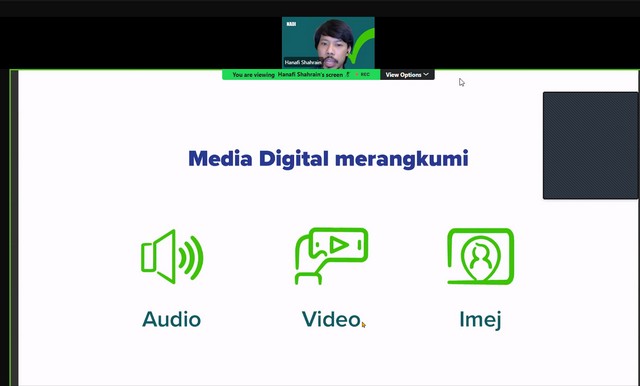 Sepanjang Webinar ini berlangsung, Encik Hanafi Shahrin memberi penerangan mengenai apa itu media digital. Encik Hanafi Shahrin memberi penerangan mengenai contoh-contoh media digital seperti audio, video dan imej. Selain itu, Encik Hanafi Shahrin memberi penerangan mengenai evolusi media dalam pemasaran seperti masa awal pemasaran, revolusi digital, zaman medai peranti mudah, hala tuju masa depan dan aliran semasa. Antara lain, Encik Hanafi Shahrin memberi penerangan mengenai proses pemasaran digital seperti membina strategi dan pelan, mereka kandungan, implimentasi dan pemantauan dan penilaian. Seterusnya, Encik Hanafi Shahrin memberi penerangan mengenai asas fotografi digital seperti memahami peralatan, teknik pencahayaan, teknik komposisi, warna dan kontras. Encik Hanafi Shahrin memberi penerangan mengenai asas penciptaan video seperti perancangan pra pencipataan dan teknik merakam video. Akhir sekali, Encik Hanafi Shahrin memberi penerangan mengenai merakam audio berkualiti dan pasca produksi.