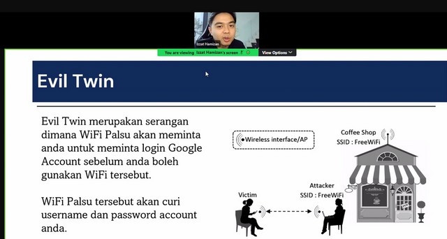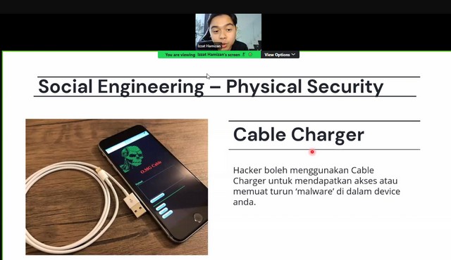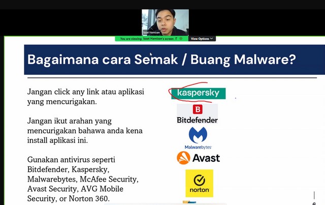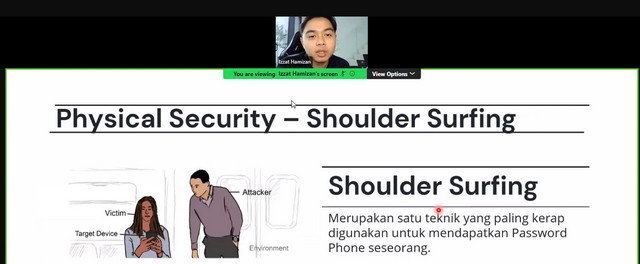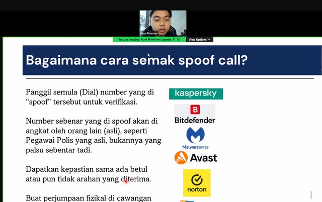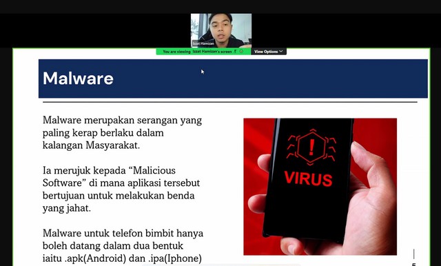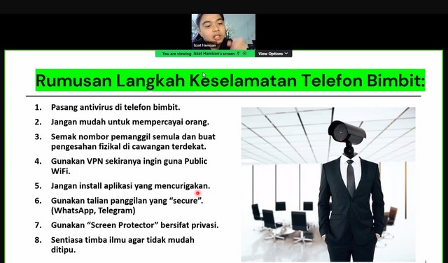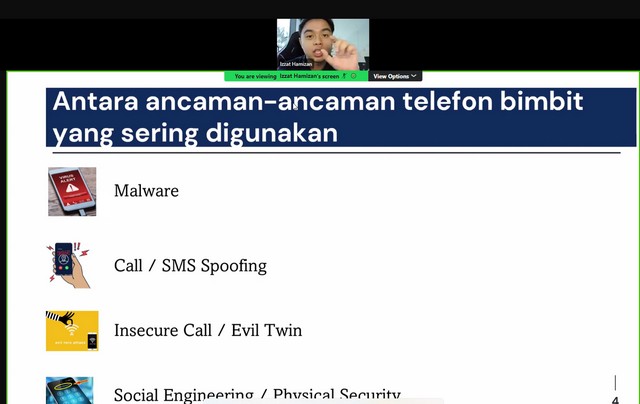 Sepanjang program ini berlangsung, Encik Izzat Hamizan menerangkan mengenai keselamatan telefon pintar dengan menekankan ancaman seperti spyware, phishing SMS, aplikasi palsu dan penipuan e-wallet. Selain itu, Encik Izzat Hamizan menerangkan mengenai kaedah perlindungan asas seperti tetapan keselamatan, kemas kini sistem, serta semakan kebenaran aplikasi. Turut disertakan demonstrasi langsung ‘phone tapping’ dan aktiviti interaktif mengenal pasti aplikasi tiruan.