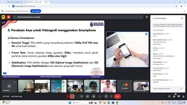 Sepanjang kelas ini berlangsung, guru MAHIR menerangkan deifinisi videografi menggunakan smartphone. Seterusnya, guru MAHIR menerangkan peralatan asas untuk videografi menggunakan smartphone seperti resolusi tinggi, frame rate dan stabilization.