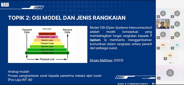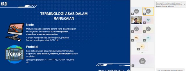 Sepanjang kelas ini berlangsung, Encik Amirul Hakim sebagai wakil kepada Cybersecurity telah memberi penerangan mengenai terminologi asas dalam rangkaian seperti node, protokol, bandwidth dan latency. Seterusnya, encik Amirul Hakim memberi penerangan mengenai osi model dan jenis rangkaian seperti transmit data, receive data dan physical link. Selain itu, encik Amirul Hakim memberi penerangan mengenai 7 layers of OSI Model. Akhir sekali, encik Amirul Hakim menerangkan mengenai kabal, wifi dan LAN.