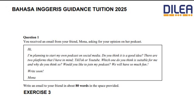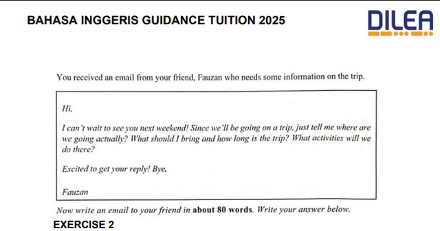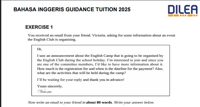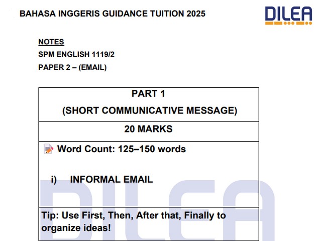 Sepanjang kelas ini berlangsung, Guru DiLea mengajar cara untuk untuk menulis email bagi informal email. Selain itu, Guru DiLea memberi tips untuk menulis kata hubung seperti First, Then, After that dan Finally. Akhir sekali, Pelajar bersama-sama Guru DiLea membuat tiga latihan untuk menulis email.