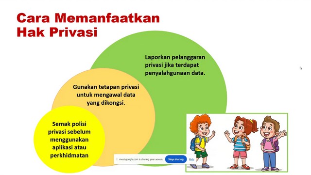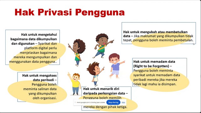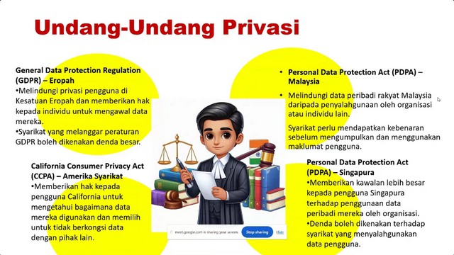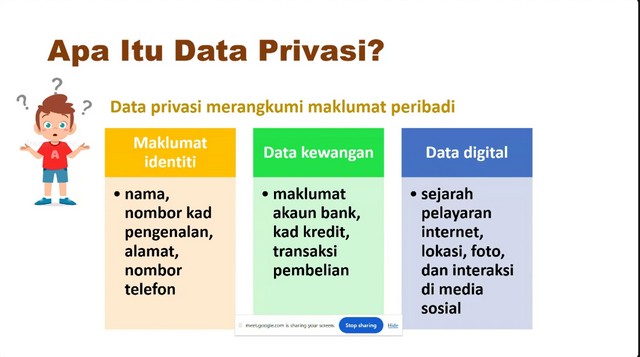 Sepanjang kelas ini berlangsung, Prof. Ts. Dr. Ariffin Abdul Mutalib memberi penerangan mengenai apa itu data privasi seperti maklumat identity, data kewangan dan data digital. Selain itu, Prof. Ts. Dr. Ariffin Abdul Mutalib memberi penerangan mengenai kepentingan data privasi. Antara lain, Prof. Ts. Dr. Ariffin Abdul Mutalib memberi penerangan mengenai risiko dan ancaman digital iaitu pencuri identiti, phishing, perisian hasad, kebocoran dara, serangan siber dan penggodaman dan penjejekan & pengumpulan data tanpa izin. Seterusnya, 4.0 Prof. Ts. Dr. Ariffin Abdul Mutalib menerangakan bagaimana cara kita dapat menlindungi diri. Akhir sekali, Prof. Ts. Dr. Ariffin Abdul Mutalib memberi penerangan mengenai hak privasi pengguna, cara memanfaatkan hak privasi dan undang-undang privasi.