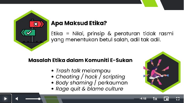 Sepanjang kelas ini berlangsung, peserta menonton video Kod Etika Pemain e-Sukan. Seterusnya, peserta menonton video objektif modul dan sebab etika penting dalam e-Sukan. Selain itu, peserta menonton video maksud etika dan masalah etika dalam komuniti e-Sukan . Antara lain, peserta menonton video tentang sikap pemain yang tidak beretika seperti suka provoke, angkuh bila menang, merendahkan pemain baru, tidak hormat masa dan tidak hormat peraturan. Akhir sekali, peserta menonton video akibat buruk tidak beretika seperti dibenci komuniti, disekat daripada pasukan, tidak diberi tajaan dan rosakkan reputasi e-Sukan tempatan.