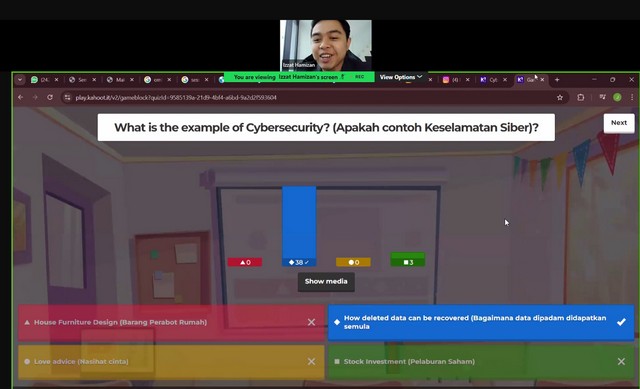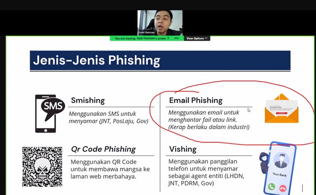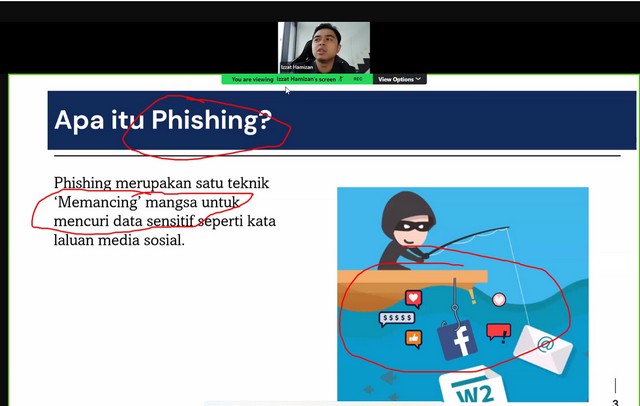 Sepanjang kelas ini berlangsung, Encik Izzat Hamizan memberi penerangan mengenai apa itu Phishing. Seterusnya, Encik Izzat Hamizan memberi penerangan mengenai jenis-jenis phishing. Selain itu, Encik Izzat Hamizan menerangkan bahawa Malaysia menduduki tangga kedua mengalami serangan Phishing. Akhir sekali, Encik Izzat Hamizan menegaskan supaya berhati-hari untuk mengelakkan serangan Phishing.