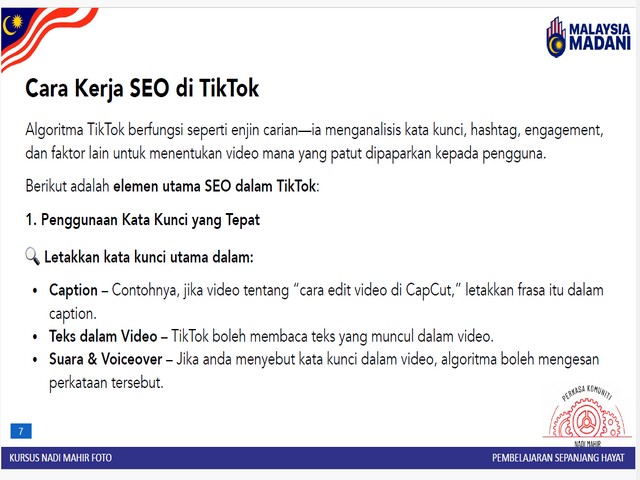 Sepanjang kelas ini berlangsung, Guru MAHIR menerangkan cara untuk menggunakan Tiktok sebagai platform Content Creator iaitu dengan mengikut peraturan SEO di Tiktok. Guru MAHIR menerangkan cara kerja SEO di Tiktok dan bagaimana Tiktok memasukkan sesetengah video tersebut menjadi video FYP.