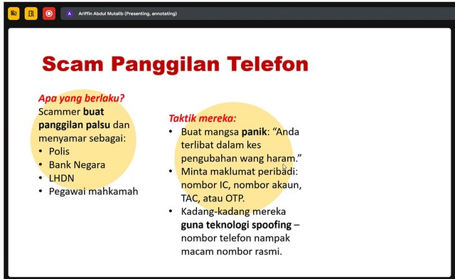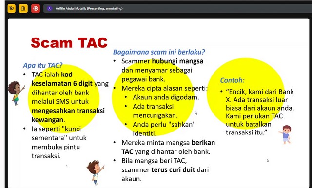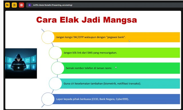 Sepanjang program ini berlangsung, Prof. Ts. Dr. Ariffin Abdul Mutalib memberi penerangan mengenai agenda kelas pada hari ini. Prof. Ts. Dr. Ariffin Abdul Mutalib memberi penerangan mengenai jenis-jenis scam berkaitan TAC (TRANSACTION AUTHORIZATION CODE) seperti Scam TAC, Scam Panggilan Telefon dan SMS Scam. Selain itu, Prof. Ts. Dr. Ariffin Abdul Mutalib memberi penerangan mengenai modus operandi scammer, contohnya kenal pasti sasaran, menyamar sebagai pihak berkuasa atau organisasi sah, cipta rasa panik dan mendesak, minta maklumat peribadi atau TAC, lakukan transaksi & curi wang dan hapus jejak. Akhir sekali, Prof. Ts. Dr. Ariffin Abdul Mutalib memberi penerangan mengenai cara untuk elak daripada menjadi mengsa seperti jangan kongsi TAC / OTP walaupun dengan pegawai bank, jangan klik link SMS yang mencurigakan, Semak nombor telefon di laman rasmi, guna ciri keselamatan tambahan dan lapor kepada pihak berkuasa.