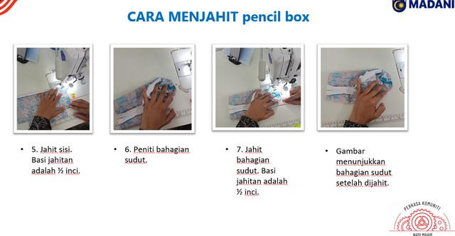 Sepanjang kelas ini berlangsung, Cikgu MAHIR telah memberi penerangan dengan lebih lanjut berkenaan modul yang akan diajar sepanjang kursus. Pada kelas minggu ini cikgu memberi penerangan mengenai peralatan yang diperlukan untuk menjahit kotal pensel kain. Peserta telah menyediakan bahan iaitu kain fabrik cotton, kain gam dan zip. Kemudian, cikgu MAHIR akan menunjukkan cara untuk menjahit kain tersebut mengikut penanda yang telah diberitahu dalam slide. Peserta akan menjahit bersama-sama cikgu MAHIR sehingga berjaya menyiapkan kotak pensel kain tersebut.