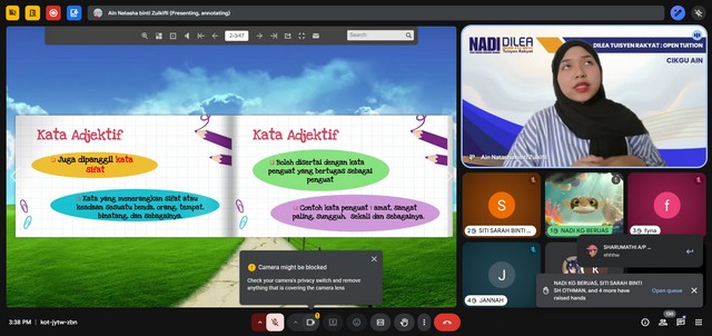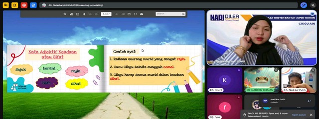 Sepanjang kelas ini berlangsung, Peserta belajar apa kata Adjektif. Seterusnya, peserta belajar jenis-jenis kata Adjektif seperti sifat, pancaindera, bentuk, cara dan sebagainya. Selain itu, peserta belajar kata Adjektif keadaan atau sifat iaitu sejuk, berani, rajin, bijak dan sihat. Akhir sekali, peserta belajar kata Adjektif Pancaindera iaitu wangi, harum, manis, bersih, kasar, pahit dan sunyi.