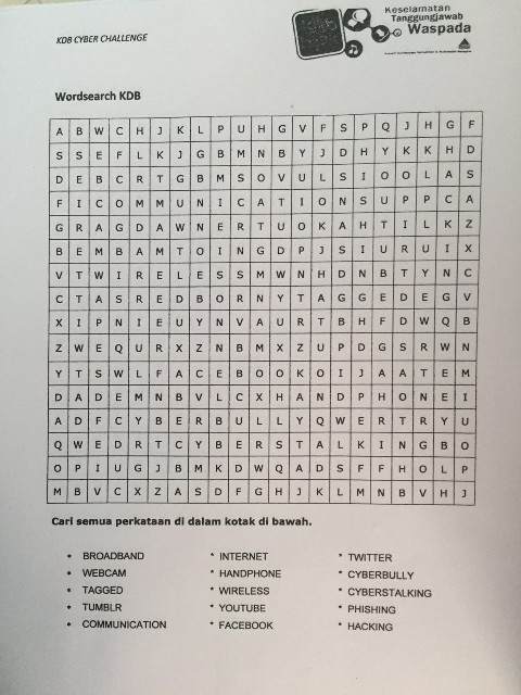17 Mac2016 | Aktiviti TerkiniPada 16 March 2016 bertempat di dalam Bilik Latihan PI Padang Besar Selatan, Perlis telah berlangsung Pertandingan Word Search KDB. Aktiviti ini diadakan pada pukul 3.00 petang sehingga 5.00 petang. Peserta perlu mencari perkataan tersembunyi dalam puzzle yang diberi mengikut dalam masa yang telah ditetapkan. Perkataan yang dicari adalah semua berkaitan KDB dan juga teknologi.