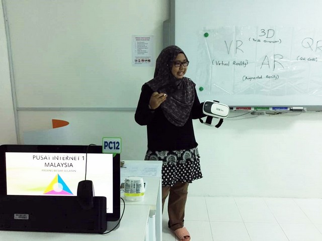 Peserta diberi penerangan tentang Virtual Reality (VR), Augmented Reality (AR) , Quick Response (QR) & 3D dan merasai sendiri tayangan video di VR Goggle. Dengan aktiviti seperti ini peserta dapat merasai pengalaman menggunakan Virtual Reality (VR) Google dan mengetahui dengan lebih mendalam tentang teknologi masa kini. Disamping itu juga, ianya dapat merapatkan hubungan silaturahim PI dengan komuniti dan dapat memperkenalkan PI dengan lebih dekat.