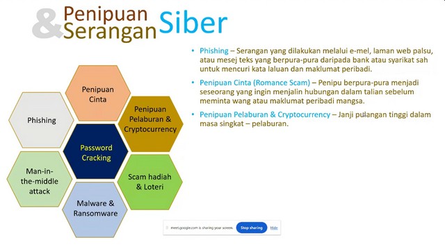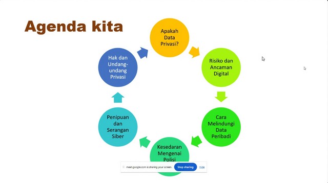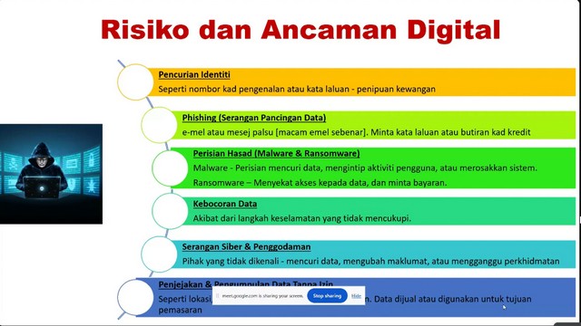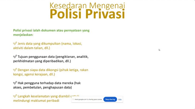 Sepanjang kelas ini berlangsung, Prof. Ts. Dr. Ariffin Abdul Mutalib memberi penerangan mengenai apa itu data privasi seperti maklumat identity, data kewangan dan data digital. Selain itu, Prof. Ts. Dr. Ariffin Abdul Mutalib memberi penerangan mengenai kepentingan data privasi. Antara lain, Prof. Ts. Dr. Ariffin Abdul Mutalib memberi penerangan mengenai risiko dan ancaman digital iaitu pencuri identiti, phishing, perisian hasad, kebocoran dara, serangan siber dan penggodaman dan penjejekan & pengumpulan data tanpa izin. Seterusnya, 4.0 Prof. Ts. Dr. Ariffin Abdul Mutalib menerangakan bagaimana cara kita dapat menlindungi diri. Akhir sekali, Prof. Ts. Dr. Ariffin Abdul Mutalib memberi penerangan mengenai hak privasi pengguna, cara memanfaatkan hak privasi dan undang-undang privasi.