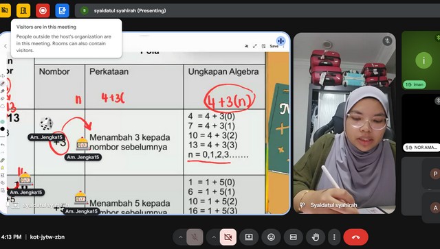 Sepanjang kelas ini berlangsung, Peserta belajar mengenai algebra. Cikgu akan memberi penerangan dahulu kemudian cikgu akan memberi latihan kepada pelajar bagi meningkatkan pemahaman pelajar. Pelajar akan bersama-sama menyelesaikan soalan-soalan tersebut bersama cikgu.